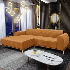 O Sofá com Chaise Esquerdo Para Sala de Estar Molino 245cm D02 da Lyam Decor, exala formosura e elegância! Excelente opção para dispor em sua sala de estar ou espera, recepção, hall de entrada, dormitório, qualquer área de circulação ou antessala entre um cômodo e outro, as possibilidades de combinação são infinitas. Seu protagonismo é notório, sem sombra de dúvidas é perfeita para qualquer ambientação que desejar colocá-la. Com sua resistente estrutura, na cor castanho com detalhes em dourado, deixarão sua decoração ainda mais sofisticada. Oferecendo máximo conforto sem deixar de transmitir todo a magnitude que seu lar merece!
