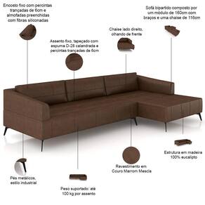 Cor dos pés: Marrom | Profundidade: 150 cm | Quantidade de Caixas de embalagem: 2 | Unidades por kit: 2 | Peso máximo suportado: 300 kg | Cor: Marrom Mescla | Formato do sofá: Linear com Chaise | Fabricante: Lyam Decor | Desenho do tecido: Liso | Requer montagem: Não, apenas o encaixe dos pés | Altura: 61 cm | Peso: 93 kg | Orientação do Sofá: Frontal | Material do estofamento: Couro | Material de enchimento do encosto: Fibras Siliconadas | Linha: Sala de Estar, Living | Densidade da espuma do assento: D-28 | Largura: 292 cm | Tipo de produto: Sofá Living | Mecanismo de abertura do produto: na | Estilo: Moderno