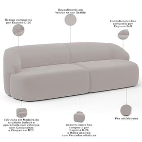 Altura: 78 cm | Color: Cinza | ColorFamily: Cinza | ColorSimple: Cinza | ColorSupplier: Grafite | Cor: Grafite | Cor dos pés: -1 | Densidade da espuma do assento: D-26 | Desenho do tecido: Liso | Estilo: Moderno | Fabricante: Lyam Decor | Formato do sofá: Linear | Largura: 220 cm | Linha: Sala de Estar | Material: Estrutura em madeira de eucalipto tratada e aparelhada com reforços, cantoneiras e chapas em MDF. | Material de enchimento do encosto: Encosto curvo fixo composto por espuma soft. | Material do estofamento: Veludo | MaterialFamily: Madeira ,Tecido | Mecanismo de abertura do produto: -1 | Model: Barolo | Orientação do Sofá: -1 | OriginCountry: | OriginState: PR | Peso: 54 kg | Peso máximo suportado: 120 kg | ProductContents: 01 Sofá | ProductHeight: 78 cm | ProductInstructions: Produto para uso em ambiente interno, nao devendo ficar exposto ao sol, calor e umidade excessivos. | ProductLength: 90 cm | ProductWarranty: 90 dias após o do produto | ProductWeight: 54 kg | ProductWidth: 220 cm | Profundidade: 90 cm | Quantidade de Caixas de embalagem: 1 | Requer montagem: Não | SizeDescription: Altura: 78 cm x Largura: 220 cm x Profundidade: 90 cm | SupplierSimpleName: Sofá 3 Lugares Curvo Orgânico Para Sala Living 220cm Barolo L06 Veludo Grafite - Lyam Decor | Tipo de produto: Sofá | Unidades por kit: 1