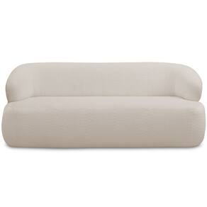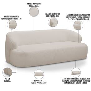 Características: Estrutura em madeira de eucalipto tratada e aparelhada com reforços, cantoneiras e chapas em MDF. Revestimento em tecido Bouclê de alta qualidade na cor Bege. Encosto curvo fixo composto por espuma soft. Assento curvo fixo composto por espuma D-26 e molas espirais. Percintas elásticas no assento para maior resistência e durabilidade. Pés em madeira. Peso suportado: Até 120 kg por assento.
