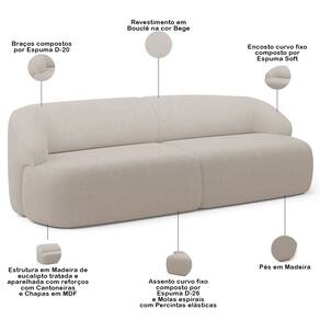 Características: Estrutura em madeira de eucalipto tratada e aparelhada com reforços, cantoneiras e chapas em MDF. Revestimento em tecido Bouclê de alta qualidade na cor Bege. Encosto curvo fixo composto por espuma soft. Assento curvo fixo composto por espuma D-26 e molas espirais. Percintas elásticas no assento para maior resistência e durabilidade. Pés em madeira. Peso suportado: Até 120 kg por assento.