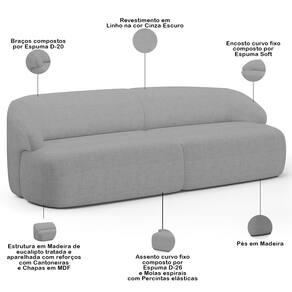 Características: Estrutura em madeira de eucalipto tratada e aparelhada com reforços, cantoneiras e chapas em MDF. Revestimento em tecido Linho de alta qualidade na cor Cinza Escuro. Encosto curvo fixo composto por espuma soft. Assento curvo fixo composto por espuma D-26 e molas espirais. Percintas elásticas no assento para maior resistência e durabilidade. Pés em madeira. Peso suportado: Até 120 kg por assento.