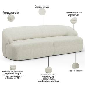 Características: Estrutura em madeira de eucalipto tratada e aparelhada com reforços, cantoneiras e chapas em MDF. Revestimento em tecido Linho de alta qualidade na cor Cru. Encosto curvo fixo composto por espuma soft. Assento curvo fixo composto por espuma D-26 e molas espirais. Percintas elásticas no assento para maior resistência e durabilidade. Pés em madeira. Peso suportado: Até 120 kg por assento.