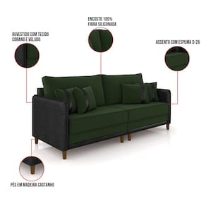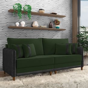 O Sofá 3 Lugares Living Valença é a escolha perfeita para quem busca um equilíbrio entre conforto e elegância em um espaço compacto. Com medidas de 192 cm, este sofá se destaca pelo design sofisticado e pela qualidade de seus materiais. O sofá é revestido em tecido sintético PU na cor Preta, com um acabamento em Veludo Verde que proporciona um toque de sofisticação e aconchego. O sofá é fabricado com madeira de reflorestamento tratada, especificamente eucalipto. Já os pés são de madeira na cor castanho, com acabamento elegante que complementa o visual geral do móvel. O sofá possui assento e encosto fixos, garantindo uma estrutura sólida e sem movimento. A espuma utilizada é a D-28, conhecida por sua durabilidade e conforto. O assento é fixo, que garante um suporte firme e duradouro. Ele é equipado com molas espirais e percintas elásticas, além de uma manta acrílica que oferece um conforto extra. Este assento é projetado para suportar até 150 kg, garantindo robustez e estabilidade. O encosto é fixo e conta com percintas elásticas que sustentam almofadas soltas preenchidas com 100% fibra siliconada, proporcionando um apoio macio e confortável para as costas. Além do mais, as almofadas do encosto do sofá são adornadas com uma fita em sintético PU que segue a mesma tonalidade do revestimento, na cor Preta. Este detalhe não apenas realça o design do sofá, mas também oferece uma finalização elegante e refinada. Os braços do sofá são preenchidos com espuma D-23, o que proporciona um suporte confortável e equilibrado. A estrutura dos braços complementa o design do sofá, oferecendo uma superfície acolhedora para descansar os braços. Para garantir a durabilidade e resistência, os pontos de tensão do sofá são fixados com grampos galvanizados antiferrugem ou aparafusados, garantindo que o móvel mantenha sua integridade ao longo do tempo. A combinação desses materiais assegura um suporte ergonômico, ideal para relaxar após um longo dia. Invista no conforto e na sofisticação que você merece, o Sofá Valença está esperando por você!"