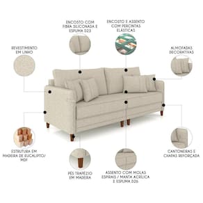 Sofá 3 Lugares Living 192cm Pé Madeira Zoe Linho Cru Z08 - Mpozenato