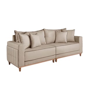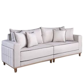 ESPECIFICAÇÕES TÉCNICA: - Material da Estrutura: Madeira maciça de eucalipto; - Material do Assento: Molas Ensacadas/Espuma D28 Soft; - Material do Encosto: Fibra siliconada; - Revestimento: Tecido Linho; - Almofada dos Assento: Fixas com manta siliconada e espuma contínua; - Almofada do Encosto: Soltas 100% fibra siliconada; - Tipo de Encosto: Fixo; - Tipo de Assento: Fixo; - Tipo de pé: Fixo; - Material dos pés: Madeira; - Possui Regulagem de Inclinação? Não; - Peso real suportado: 120kg; - Quantidade Lugares: 3 Lugares; - Garantia: 3 Meses; - Dimensões do Produto (LarguraXProfundidadeXAltura):216x91x89cm