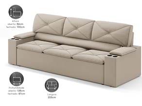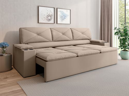 A experiência de relaxamento é completa com o assento retrátil e encosto reclinável, permitindo que você adapte o sofá para ler, assistir TV ou descansar. As almofadas fixas levam enchimento em fibra siliconizada e flocos de espuma, garantindo um toque extremamente aconchegante.