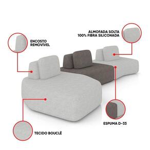 Sofá 3 Lugares Orgânico Com Chaise E 2 Módulos Berlim Bouclê Cinza Claro/grafite K01 - D'rossi Transforme sua sala de estar com o Sofá 3 Lugares Orgânico Berlim, composto por 01 Módulo Chaise, 01 Módulo Central e 01 Módulo de Canto, com largura total de 480 cm, em uma composição elegante que combina os tons Cinza Claro/Grafite, revestido em Bouclê para um toque macio e visual sofisticado. Seu design moderno e minimalista exibe linhas suaves e contornos arredondados, criando um visual elegante que harmoniza com diferentes estilos de decoração. Por ser modular, o conjunto permite diversas composições: eles podem ser integrados a outros peças para formar sofás amplos ou utilizados separadamente como assentos adicionais. O tecido confere toque macio e aparência sofisticada, enquanto a estrutura em madeira de eucalipto com reforços em MDF assegura resistência e durabilidade prolongada. O assento fixo, composto por molas espirais, percintas elásticas e espuma D-33 de alta densidade, proporciona conforto contínuo. Já o encosto solto (Ilha) e as almofadas extra ampliam a sensação de bem-estar. Um conjunto sofisticado e flexível, ideal para sala de estar, escritório ou espaço de convivência. Dimensões Gerais dos Módulos: Altura Total (base/encosto): 72 cm Largura Total: 480 cm Profundidade: Dê 110 a 140 cm Peso Total: 56 kg Dimensões do Módulo Chaise: Altura Total (base/encosto): 72 cm Largura Total: 165 cm Profundidade: Dê 110 a 140 cm Altura do Assento (do chão): 42 cm Peso Total: 20 kg Dimensões do Módulo Central: Altura Total (base/encosto): 72 cm Largura Total: 140 cm Profundidade: Dê 110 a 140 cm Altura do Assento (do chão): 42 cm Peso Total: 18 kg Dimensões do Módulo Canto: Altura Total (base/encosto): 72 cm Largura Total: 175 cm Profundidade (Variável, conforme a posição do encosto): Dê 110 a 120 cm Altura do Assento (do chão): 42 cm Peso Total: 18 kg Medidas do Encosto e Almofada: Encosto (Ilha): 30cm (A) x 95cm (L) Almofada (Solta): 45cm (A) x 65cm (L) OBSERVAÇÃO IMPORTANTE: Disponibilizamos duas imagens de croqui que demonstram diferentes formas de montagem do sofá. A profundidade dos módulos varia conforme a posição do encosto. Especificações do Produto: Estrutura: Madeira de Eucalipto; Reforços com cantoneiras e chapas em MDF Base: Encosto em fibra siliconada e espuma; assento com percintas elásticas e mola espiral. Espuma do Assento: D-33 (alta qualidade) Revestimento: Bouclê Possui Braços: Não Possui Pés: Sim Material dos Pés: Madeira, fixação por parafusos Possui Rodízios: Não Peso Suportado: Até 150 Kg por módulo Tipo de Encosto: Encosto solto, com enchimento em fibra siliconada Tipo de Assento: Assento fixo, com sustentação de molas e percintas Modularidade: Acompanha almofada solta (100% fibra siliconada); Inclui ilhas com manta acrílica. É Retrátil: Não É Reclinável: Não Diferenciais: Design orgânico e modular, com encosto solto e removível; Módulo independente, podendo ser utilizado sozinho ou combinado com outros módulos da mesma linha. Montagem: O produto é enviado montado Garantia: 90 dias contra defeito de fabricação Instruções de Limpeza: Utilizar um pano limpo e levemente úmido Quantidade de Volumes: 3 Caixas Medida das Embalagens: Caixa 1: 170 x 140 x 65 cm; Caixa 2: 144 x 118 x 65 cm; Caixa 3: 176 x 140 x 65 cm Peso Total das Embalagens: 58 Kg Entrega: É feita somente até o térreo ou portaria. Confira sempre as medidas das embalagens para assegurar que o produto passe por portas e escadas do local.