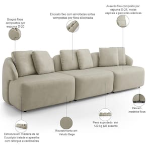 ProductLength: 87 cm | Color: Bege | ColorFamily: Bege | Model: Arlo | ProductInstructions: Produto para uso em ambiente interno, nao devendo ficar exposto ao sol, calor e umidade excessivos. | Quantidade de Caixas de embalagem: 3 | Unidades por kit: 1 | Requer montagem: Não | Cor: Bege | Tipo de produto: Sofá Modulado | Fabricante: Lyam Decor | Altura: 87 cm | Orientação do Sofá: Linear | Peso: 130 kg | Mecanismo de abertura do produto: na | Material de enchimento do encosto: Fibra Siliconada | Densidade da espuma do assento: D-26 | Peso máximo suportado: 360 kg | Desenho do tecido: Liso | Estilo: Moderno | ColorSupplier: Bege | Formato do sofá: Orgânico | ColorSimple: Bege | ProductWidth: 234 cm | OriginState: PR | SizeDescription: Altura: 87 cm x Largura: 234 cm x Profundidade: 87 cm | Linha: Sala de Estar, Living | ProductWarranty: 90 dias após o recebimento do produto | Cor dos pés: Marrom Escuro | OriginCountry: Brasil | Largura: 234 cm | ProductHeight: 87 cm | SupplierSimpleName: Sofá 3 Lugares Para Sala de Estar Living 234cm Arlo F04 Veludo Bege - Lyam Decor | Material do estofamento: Veludo | Material: Madeira de Eucalipto, Cantoneiras, Chapas em MDF | MaterialFamily: Madeira de Eucalipto | ProductWeight: 130 kg | Profundidade: 87 cm | ProductContents: 01 Sofá