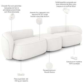 Unidades por kit: 2 | Mecanismo de abertura do produto: na | Fabricante: Lyam Decor | Material: Madeira de Eucalipto | Cor: Branco | Color: Branco | Estilo: Orgânico | Formato do sofá: Modular | Desenho do tecido: Liso | ProductWarranty: 90 dias após o recebimento do produto | OriginCountry: Brasil | SizeDescription: Altura: 70 cm x Largura: 302 cm x Profundidade: 93 cm | Profundidade: 93 cm | Requer montagem: Não, apenas o encaixe dos pés | Peso máximo suportado: 300 kg | ProductHeight: 70 cm | OriginState: PR | ProductInstructions: Produto para uso em ambiente interno, nao devendo ficar exposto ao sol, calor e umidade excessivos. | Peso: 82 kg | ColorFamily: Branco | ColorSimple: Branco | ColorSupplier: Branco | Linha: Sala de Estar, Living | Largura: 302 cm | Densidade da espuma do assento: HR26 | Cor dos pés: Marrom | SupplierSimpleName: Sofá 3 Lugares Para Sala Living Orgânico com Puff 302cm Luft P08 Bouclê Branco - Lyam Decor | Quantidade de Caixas de embalagem: 3 | Altura: 70 cm | Tipo de produto: Sofá Living, Sofá Orgânico | Orientação do Sofá: Frontal | Material do estofamento: Bouclê | Material de enchimento do encosto: Fibras Siliconadas | Model: Luft | MaterialFamily: Madeira de Eucalipto | ProductWidth: 302 cm | ProductWeight: 82 kg | ProductContents: 01 Sofá | ProductLength: 93 cm
