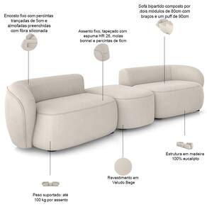 Sofá bipartido composto por dois módulos de 80cm com braços e um puff de 90cm.