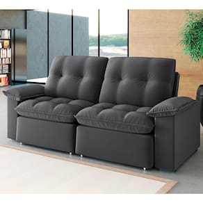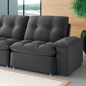 Ele possui as seguintes característica: Medidas de de 2,30 cm, estrutura em madeira de reflorestamento tratada (eucalipto); percintas elásticas no encosto, percintas elásticas com molas ensacadas no assento; assento retrátil com espuma D-26 de alta densidade, permitindo uma melhor sustentação; encosto 100% de fibra siliconada com espuma de excelente qualidade; encosto reclinável com catraca de ativação em até 4 posições e pés de plástico rosqueável o que garante muita segurança e conforto ao usuário, e seu revestimento em Veludo no tom Grafite, possui beleza, suavidade ao toque, combinando com diversos ambientes.