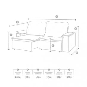 Dimensões: Altura: 115 cm Largura: 230 cm Profundidade Fechado: 125 cm Profundidade Aberto: 175 cm Peso: 76,00 kg