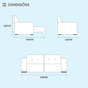 Dimensões do Produto: Altura aproximada: 105 cm. Largura aproximada: 125 cm. Abertura aproximada: 180 cm. Módulos: 90 cm. Comprimento: 230 cm. Braços: 25 cm.