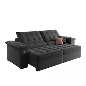 Características: Densidade D 26 Reclinável: catraca com 5 posições Retrátil: sistema corrediças metálicas Duplo molejo: molas espirais e molas ensacadas Percintas elásticas Madeira: Eucalipto e reflorestamento tratado Encosto: 100 silicone Almofada braça: 100 silicone Almofadas decorativas: 100 silicone Pillow top: 18m Rodizio: silicone Com entrada USB-C