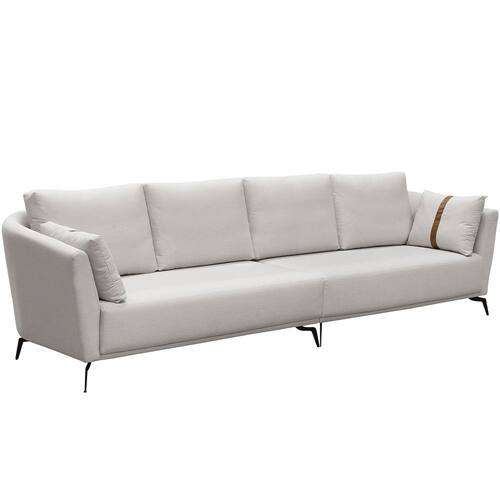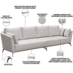 Características: Estrutura em madeira maciça 100% eucalipto de reflorestamento ecológico. Revestimento em tecido Veludo de alta qualidade na cor Bege. Encosto fixo com almofadas soltas e enchimento 100% fibra siliconada. Assento fixo com espuma D-28 contínua soft, manta siliconada de 200g, percintas elásticas de alta resistência para maior sustentação e molas bonnel 15cm de altura. Acompanha duas almofadas decorativas com detalhe em couro. Pés metálicos, estilo industrial. 02 assentos de 90 cm cada. Peso suportado: Até 120 kg por assento.