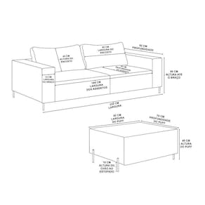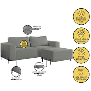 A base e estrutura inferior em ferro proporcionam resistência e um visual contemporâneo. Além disso, o produto acompanha um puff, que pode ser utilizado como apoio de pés ou assento adicional, agregando versatilidade ao ambiente.