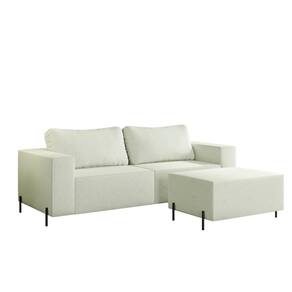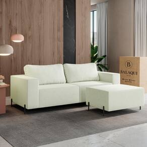 A base e estrutura inferior em ferro proporcionam resistência e um visual contemporâneo. Além disso, o produto acompanha um puff, que pode ser utilizado como apoio de pés ou assento adicional, agregando versatilidade ao ambiente.
