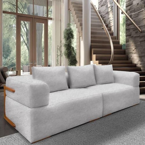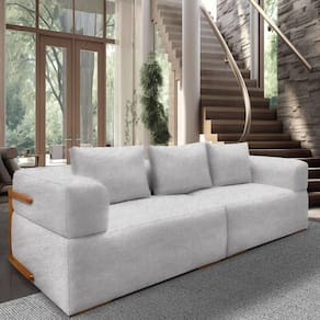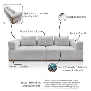O Sofá Scott 4 Lugares da Lucadi combina o aconchego do tecido bouclé com a elegância natural do aplique em madeira Jequitibá, criando uma peça sofisticada, versátil e extremamente confortável. Seu design modular, composto por dois módulos de 1,30 m, estética contemporânea, funcionalidade e presença para salas de estar, varandas gourmet e ambientes integrados. O toque macio do bouclé, aliado ao assento com molas bonel, espuma HR28 e plumante em silicone, garante uma experiência acolhedora e durável.