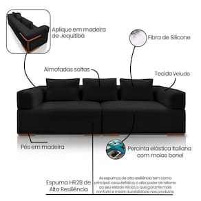 Assento: Fixo, com percintas elásticas italianas, molas bonel, espuma HR28 e plumante em silicone
