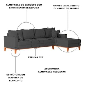 Montagem: O produto vai montado, apenas rosquear os pés e encaixar a Chaise no Sofá na peça lateral.