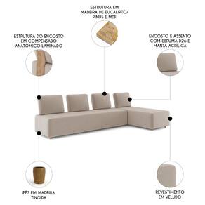 Características do Produto Material da Estrutura: Madeira de Eucalipto/Pinus e placas MDF. Material da Espuma: Espuma D-26, fibras, flocos e manta acrílica. Encosto: Compensado anatômico laminado. Peso Suportado: 100 Kg por lugar, sem impacto. Revestimento: Veludo. Tipo de Encosto: Fixo. Tipo de Assento: Fixo. Quantidade de Lugares: Sofá 3 Lugares/Chaise 1 Lugar. Possui Pés: Sim. Material dos Pés: Madeira. Diferenciais: - Design moderno. - Pés em madeira tingida. - Encosto com fibras, flocos e espuma D-26. - Assento com manta acrílica e espuma D-26. - Percintas elásticas no assento para sustentação. - Estrutura do encosto em compensado anatômico laminado. Sistema de Montagem: O produto é enviado montado, sendo necessário somente parafusar os pés. Manual de Montagem: Não. Conteúdo da Embalagem: 1 Sofá, 1 Chaise. Volumes: 2 Volumes. Garantia do Fabricante: 90 dias contra defeito de fabricação. Montagem: Recomendamos que seja feita por um profissional. Recomendação de Limpeza: Utilize pano levemente úmido.