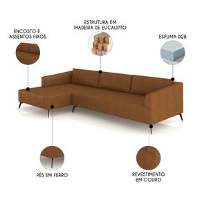 Características do Produto Material da Estrutura: Madeira de eucalipto. Material da Espuma: Espuma D28. Peso Suportado: 120 Kg por Assento. Revestimento: Couro. Tipo de Encosto: Fixo. Tipo de Assento: Fixo. Quantidade de Assentos: 3 Assentos. Sugestão de Lugares: 5 Lugares. Possui Pés: Sim. Material Dos Pés: Ferro. Altura Dos Pés: 19 cm. Diferenciais: - Design moderno. - 100% Couro. - Chaise fixa para maior conforto. - Estrutura madeira eucalipto. Sistema de Montagem: O produto é enviado montado, necessário somente parafusar os pés e encaixar os módulos. Conteúdo da Embalagem: 1 Sofá. Volumes: 2 Volumes. Garantia do Fabricante: 90 dias contra defeito de fabricação. Montagem: Recomendamos que seja feita por um profissional. Recomendação de Limpeza: Utilize pano levemente úmido.