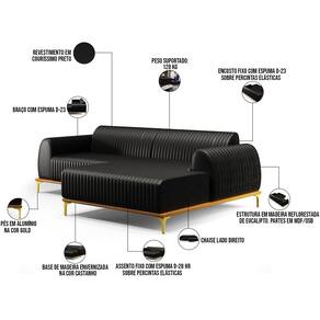 O Sofá 5 Lugares com Chaise Direito Para Sala de Estar Molino 300cm D02 Couríssimo Preto B-159 - Lyam Decor exala formosura e elegância! Excelente opção para dispor em sua sala de estar ou espera, recepção, hall de entrada, dormitório, qualquer área de circulação ou antessala entre um cômodo e outro, as possibilidades de combinação são infinitas. Seu protagonismo é notório, sem sombra de dúvidas é perfeita para qualquer ambientação que desejar colocá-la.