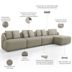 Sofá modulado contendo: 01 assento com braço, 02 assentos sem braço e 01 chaise.