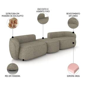 Características do Produto Material da Estrutura: Madeira de eucalipto. Material da Espuma: Espuma HR26. Peso Suportado: 120 Kg por Assento. Revestimento: Linho. Tipo de Encosto: Fixo. Tipo de Assento: Fixo. Quantidade de Assentos: 2 Assentos. Sugestão de Lugares: 5 Lugares. Possui Pés: Sim. Material Dos Pés: Madeira. Altura Dos Pés: 3 cm. Diferenciais: - Design moderno. - Revestimento em linho. - Almofadas soltas com fibra de silicone. - Estrutura madeira eucalipto. Sistema de Montagem: O produto é enviado montado, necessário somente parafusar os pés e encaixar os módulos. Conteúdo da Embalagem: 1 Sofá. Volumes: 3 Volumes. Garantia do Fabricante: 90 dias contra defeito de fabricação. Montagem: Recomendamos que seja feita por um profissional. Recomendação de Limpeza: Utilize pano levemente úmido.