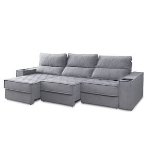 Revestido em suede macio e resistente, possui assentos retráteis e encostos reclináveis, ideais para relaxar. Sua estrutura em madeira de eucalipto com percintas elásticas suporta até 150 kg por assento. O enchimento em fibra siliconada e os pés reforçados garantem firmeza e durabilidade.