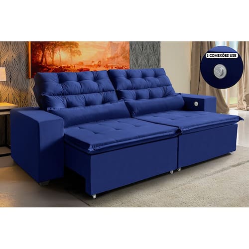 Sabe aquela sensação de felicidade e satisfação que você sente quando faz uma boa escolha?! Pois bem, essa é a sensação de comprar um sofá América com tecnologia de carregamento USB. Um produto moderno, inovador com design e Tecnologia que você merece, e ainda combina com qualquer ambiente e o deixa ainda mais lindo e aconchegante. Ele possui encosto reclinável em cinco posições, proporcionando-lhe mais conforto na hora do descanso. E não para por aí: seu assento retrátil conta com espuma D28 e molas espirais, transformando seu sofá em uma verdadeira cama para assistir seu filme preferido. Itens Inclusos: 1 Sofá Com Tecnologia de carregamento USB. Medidas do sofá: - Largura: 212cm - Altura: 102cm - Profundidade fechado: 100cm - Profundidade aberto: 140cm - Pé de tabaco:0,5 cm - Rodas de silicone Características Sofá: - Encosto Reclinável com 5 posições, almofadas fixas compostas de 100% fibra siliconada para maior conforto. - Assentos retráteis com 25cm em Espuma D28 com percintas pneumáticas e feltro para proteger do atrito. - Molas Espirais que garante ainda mais o conforto. - Braços com 25cm de largura e com espuma D23. - Fixação: Grampos galvanizados antiferrugem. - Estrutura de Madeira maciça 100% eucalipto de reflorestamento, produto ecologicamente correto. - Indicado para: Sala de Filmes, Sala de Gamer, Sala de estar, Sala de Leitura, Sala de Descanso. - Ideal para carregar: Celular, Controle Gamer, Fone Gamer, e outros dispositivos eletrônicos que utilizam USB. Informações técnicas do USB: - Quantidade de entradas: 3 Unidade; - Voltagem: Bivolt (127 – 220 Volts); - Input: 100-240VAC; - 50/60Hz - 0.6ª - O/P: DC12V - 2000mA Informações Complementares: - Suporte até 120kg por assento; - Montagem Simples; - 3 Meses de garantia; - 2 Módulos. Informações importantes: – Os objetos que ambientam as fotos não acompanham o produto. – Tonalidade de cores pode sofrer variação conforme monitor visualizador. – Os tecidos podem sofrer alterações de tonalidades dependendo do lote de produção. – Verifique as dimensões do produto e certifique-se que o percurso que ele fará até o local de uso permite sua passagem. – Quaisquer despesas ou danos no transporte até o local de uso ficam a cargo do cliente. – Em situação de escadaria ou Elevadores - Entregadores efetua apenas na portaria.