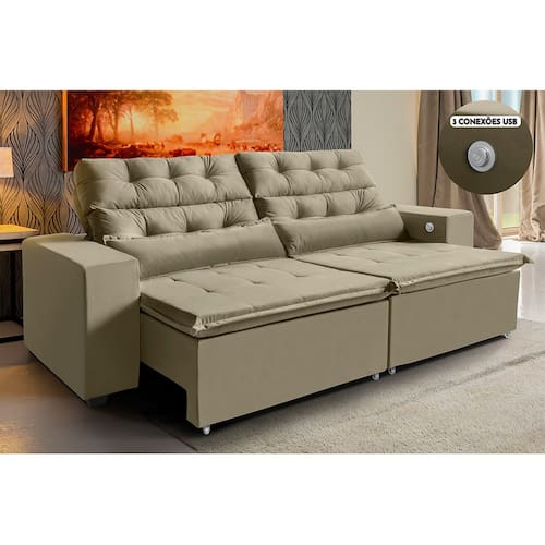 Sabe aquela sensação de felicidade e satisfação que você sente quando faz uma boa escolha?! Pois bem, essa é a sensação de comprar um sofá América com tecnologia de carregamento USB. Um produto moderno, inovador com design e Tecnologia que você merece, e ainda combina com qualquer ambiente e o deixa ainda mais lindo e aconchegante. Ele possui encosto reclinável em cinco posições, proporcionando-lhe mais conforto na hora do descanso. E não para por aí: seu assento retrátil conta com espuma D28 e molas espirais, transformando seu sofá em uma verdadeira cama para assistir seu filme preferido. Itens Inclusos: 1 Sofá Com Tecnologia de carregamento USB. Medidas do sofá: - Largura: 252cm - Altura: 102cm - Profundidade fechado: 100cm - Profundidade aberto: 140cm - Pé de tabaco:0,5 cm - Rodas de silicone Características Sofá: - Encosto Reclinável com 5 posições, almofadas fixas compostas de 100% fibra siliconada para maior conforto. - Assentos retráteis com 25cm em Espuma D28 com percintas pneumáticas e feltro para proteger do atrito. - Molas Espirais que garante ainda mais o conforto. - Braços com 25cm de largura e com espuma D23. - Fixação: Grampos galvanizados antiferrugem. - Estrutura de Madeira maciça 100% eucalipto de reflorestamento, produto ecologicamente correto. - Indicado para: Sala de Filmes, Sala de Gamer, Sala de estar, Sala de Leitura, Sala de Descanso. - Ideal para carregar: Celular, Controle Gamer, Fone Gamer, e outros dispositivos eletrônicos que utilizam USB. Informações técnicas do USB: - Quantidade de entradas: 3 Unidade; - Voltagem: Bivolt (127 – 220 Volts); - Input: 100-240VAC; - 50/60Hz - 0.6ª - O/P: DC12V - 2000mA Informações Complementares: - Suporte até 120kg por assento; - Montagem Simples; - 3 Meses de garantia; - 2 Módulos. Informações importantes: – Os objetos que ambientam as fotos não acompanham o produto. – Tonalidade de cores pode sofrer variação conforme monitor visualizador. – Os tecidos podem sofrer alterações de tonalidades dependendo do lote de produção. – Verifique as dimensões do produto e certifique-se que o percurso que ele fará até o local de uso permite sua passagem. – Quaisquer despesas ou danos no transporte até o local de uso ficam a cargo do cliente. – Em situação de escadaria ou Elevadores - Entregadores efetua apenas na portaria.