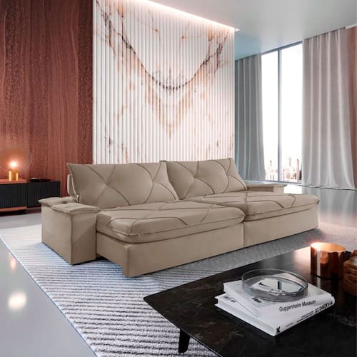 Com um design retrátil, oferecemos o que há de mais avançado em termos de conforto e durabilidade. Equipado com percinta elástica, molas espirais, pillow de 18cm e espuma D28, cada momento sentado é uma celebração do relaxamento. O encosto reclinável em até 90°, proporciona a flexibilidade ideal para os seus momentos de descanso. As almofadas, preenchidas com fibras siliconadas, não apenas suportam, mas envolvem você em um abraço reconfortante. Os braços, feitos da mesma espuma D28, são mais do que simples apoios. São a extensão do seu conforto, garantindo estabilidade e suporte em cada posição.