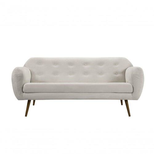 Sofá fabricado em madeira de eucalipto, revestido com espuma D28 e tecido, detalhes de botonê em seu encosto. Pés em madeira tauari. Sofá com estilo retrô, charmoso, elegante e compacto, fará toda diferença no ambiente em que for colocado.