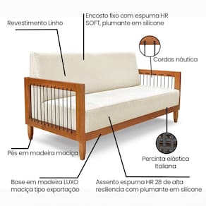 Tramada em corda náutica o Sofá Bex traz um design único a sua essência, sua base resistente consiste em madeira maciça padrão exportação, seu conforto é sem igual, a poltrona se destaca principalmente em área gourmet ou sacadas ou no local desejado trazendo muito charme. Produto Montado: Não Acompanha Almofadas extras: Não Almofada do assento: Fixa Almofada do encosto: Fixa Altura do assento até o chão: 42.0000 Altura do Braço: 17 cm Altura do Encosto: 46 cm Altura dos Pés: 17 cm Ambiente Principal: Sala de Estar codigo_ean: 7909903704134 Cor: Natural Cor do Produto: Natural Densidade do Assento: D-28 Enchimento do Assento: Fibra Siliconada Enchimento do Encosto: Fibra Siliconada Firmeza do Assento: Médio Informações Complementares: Tramada em corda náutica O sofá Bex traz um design único a sua essência, sua base resistente consiste em madeira maciça padrão exportação, seu conforto é sem igual, a poltrona se destaca principalmente em área gourmet ou sacadas ou no local desejado traze Itens Inclusos: 1 Sofá Linha ou Coleção: Bex Manual de Montagem e Instalação: https://product-hub-prd.madeiramadeira.com.br/909774/documents/1a8ac6a5-98c9-407a-9145-454fcd78e7d7197703741221716403470394.pdf Material dos Pés: Eucalipto Montagem Flex: Não Necessita Montagem: Não Nível de Conforto: Confortável Origem do Produto: Nacional Peso: 37,6 kg Pet Friendly: Não Possui Percintas Elásticas: Sim Possui Pés: 04 Possui Rodízio: Não Recomendações de Uso, Manutenção e Limpeza: Limpeza: Utilize pano levemente úmido Revestimento do Braço: Madeira Maciça Suporta Até (kg): 150 kg Tecido Predominante: Linho Tipo de Encosto: Fixo Tipo de Mola: Não Possui