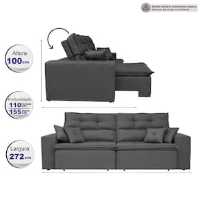 Informações importantes: - Os objetos que ambientam as fotos não acompanham o produto. - Os tecidos podem sofrer alterações de tonalidades dependendo do lote de produção. - Verifique as dimensões do produto e certifique-se que o percurso que ele fará até o local de uso permite sua passagem. - Nos responsabilizamos pela entrega dos produtos adquiridos até a porta de entrada ou portaria do endereço indicado. Quaisquer despesas ou dano no transporte até o local de uso ficam a cargo do cliente. "As transportadoras não sobem estadas ou elevadores". Cor: Cinza | Tonalidade: Cinza | Altura: 100 | Largura: 272 | Profundidade: 110 | Encosto Reclinavel: Sim | Comodo indicado: Salas | Produto: Sofá | Cor principal: Cinza | Conservação e Manutenção do Produto: Para maior durabilidade, recomendamos que a limpeza dos estofados com revestimento em tecido, seja feito com aspirador de pó em baixa rotação ou escova com cerdas macias para a eliminação de poeira e pano úmido em água. Não utilizar agentes químicos! | Custo da Manutenção: Baixo | Possui Encosto: Sim | Tempo Estimado de Montagem: 20 Minutos | Complexidade de Montagem: Baixa: pode ser montado por uma pessoa leiga | Dimensão: Profundidade Fechado 110cm e Aberto 155cm | Marca: Cama InBox | Desenho do tecido: Liso | Modelo: Cairo | Fabricante: Cama inBox | É sofá-cama: Não | É sofá de canto: Não | Estilo: Moderno | Acessórios incluídos: Almofadas | Condição do item: Novo | É kit: Não | Peso do Produto: 80 | Modelo Via: Retrátil/Reclinável | Estado de Origem: PR | Material para Filtro: Tecido