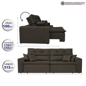 Informações importantes: - Os objetos que ambientam as fotos não acompanham o produto. - Os tecidos podem sofrer alterações de tonalidades dependendo do lote de produção. - Verifique as dimensões do produto e certifique-se que o percurso que ele fará até o local de uso permite sua passagem. - Nos responsabilizamos pela entrega dos produtos adquiridos até a porta de entrada ou portaria do endereço indicado. Quaisquer despesas ou dano no transporte até o local de uso ficam a cargo do cliente. "As transportadoras não sobem estadas ou elevadores". Cor: Café | Altura: 100 | Largura: 312 | Profundidade: 110 | Encosto Reclinavel: Sim | Comodo indicado: Salas | Produto: Sofá | Cor principal: Café | Conservação e Manutenção do Produto: Para maior durabilidade, recomendamos que a limpeza dos estofados com revestimento em tecido, seja feito com aspirador de pó em baixa rotação ou escova com cerdas macias para a eliminação de poeira e pano úmido em água. Não utilizar agentes químicos! | Custo da Manutenção: Baixo | Possui Encosto: Sim | Tempo Estimado de Montagem: 20 Minutos | Complexidade de Montagem: Baixa: pode ser montado por uma pessoa leiga | Marca: Cama InBox | Dimensão: Profundidade Fechado 110cm e Aberto 155cm | Desenho do tecido: Liso | Modelo: Cairo | Fabricante: Cama inBox | É sofá-cama: Não | É sofá de canto: Não | Estilo: Moderno | Acessórios incluídos: Almofadas | Condição do item: Novo | É kit: Não | Peso do Produto: 80 | Estado de Origem: PR | Modelo Via: Retrátil/Reclinável | Material para Filtro: Tecido | Quantidade de Lugares: 5