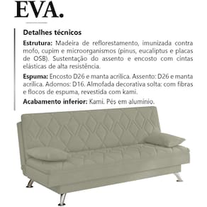 Sofa Cama 3 Lugares 193 cm Eva Veludo, é a escolha certa para você que busca conforto e bem-estar, tornando o ambiente em que estiver muito mais elegante e moderno. Estrutura em madeira de reflorestamento (pinus, eucaliptos e placas de OSB) e cintas elásticas de alta resistência. Composto por madeira imunizada contra mofo, cupim e microrganismos, revestimento em tecido veludo, encosto em espuma D-26 com manta acrílica, assento em espuma D-26 com manta acrílica, com abertura de até 124 cm, adornos em espuma D-16, almofadas decorativas soltas, com fibras e flocos de espuma, revestida com kami e manta acrílica. acabamento inferior em kami, e 4 pés em alumínio. Suportando até 130 kg por assento. Possui design diferenciado, que oferece sofisticação, versatilidade e charme ao seu ambiente. Este móvel chegará na sua casa separado em 01 volume.