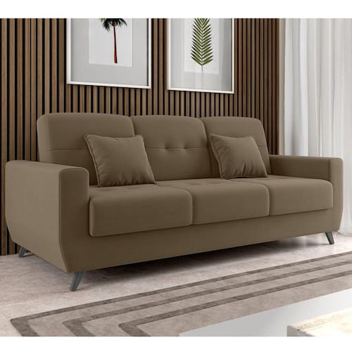 Sistema de Abertura: Para abertura, basta manusear o encosto inclinando-o para frente e voltar para trás deitando totalmente o encosto. Para a posição intermediária, retorne o encosto para cima até que faça um estalo, então o solte e terá a posição de leitura. Apresentação do Produto: O sofá-cama Pâmarroma vem de uma linhagem de modelos que são reclinados por sistemas de catraca de três pinos, onde se utiliza no mesmo produto três posições diferentes: sentado como sofá, leitura com reclino de meio corpo e deitado onde se desfruta com o conforto de cama necessário para toda a noite. Este modelo oferece ainda a praticidade e a multifuncionalidade de um baú abaixo do assento. Para abri-lo levante o assento para cima. Acompanha Almofadas extras: 02 Almofada do assento: Fixa Almofada do encosto: Fixa Altura do assento até o chão: 25 Altura do Encosto: 45 Altura dos Pés: 6 Ambiente Principal: Sala de Estar Complexidade da Montagem: Cor: Marrom Claro Cor do Produto: Marrom Claro Densidade do Assento: D-26 Densidade do Encosto: D-26 Enchimento do Assento: Espuma Enchimento do Braço: Espuma D-26 Enchimento do Encosto: Espuma Estilo de Braço: Braços Redondos Firmeza do Assento: Médio Informações Complementares: 100 KG por assento Itens Inclusos: 1 Sofá Cara, Kit Pés e Manual de Montagem Largura do Sofá Maior: Linha ou Coleção: Manual de Especificação Técnica: Manual de Montagem e Instalação: Material dos Pés: Madeira Medida como Cama (A x L x P): 50x207x114cm Modelo: Somente Reclinável Necessita Montagem: Não Origem do Produto: Nacional Peso: 64 Pet Friendly: Não Possui Baú: Sim Possui Percintas Elásticas: Sim Possui Pés: 04 Possui Rodízio: Não Profundidade Quando Estendido: Reclinável: Sim Recomendações de Uso, Manutenção e Limpeza: Para maior durabilidade, recomendamos que a limpeza dos estofados com revestimento em tecido, seja feito com aspirador de pó em baixa rotação ou escova com cerdas Revestimento do Assento: Veludo Revestimento do Braço: Veludo Revestimento do Encosto: Veludo Rodízio com Trava: Não Sistema de Montagem: Tecido Predominante: Veludo Tipo de Assento: Fixo Tipo de Encosto: Fixo Tipo de Mola: Não Possui