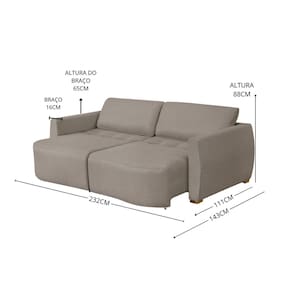 A verdadeira genialidade do ITALIA reside em sua versatilidade. Com dimensões que o tornam adequado tanto para salas de estar amplas quanto para espaços mais compactos, este estofado se adapta a qualquer dinâmica. Sua capacidade de se transformar em um aconchegante sofá-cama eleva seu valor prático, solucionando a necessidade de acomodar hóspedes. Produto Montado: Sim Acompanha Almofadas extras: Não Almofada do assento: Fixa Almofada do encosto: Fixa Altura do assento até o chão: 46.0000 Altura do Braço: 65 cm Altura do Encosto: 42 cm Altura dos Pés: 4 cm Altura Máxima dos Pés: 4.0000 Ambiente Principal: Sala de Estar codigo_ean: 7900288272935 Complexidade da Montagem: Média: pode ser montado por mais de uma pessoa e/ou necessite de maior conhecimento para montagem Consistência do Assento: Macio Cor: Bege Cor do Produto: Bege Densidade do Assento: D-28 Enchimento do Assento: Espuma Enchimento do Braço: Espuma D-23 Estilo de Braço: Braços Redondos Firmeza do Assento: Macio Itens Inclusos: 1 Sofá e Kit Montagem Largura do Braço: 16 cm Largura Total: 232 cm Linha ou Coleção: Italia Manual de Especificação Técnica: https://product-hub-prd.madeiramadeira.com.br/673180627/documents/9ec70b3f-15fd-442d-8c11-9977755c3cd23290400579917612375007442.pdf Manual de Montagem e Instalação: https://product-hub-prd.madeiramadeira.com.br/673180627/documents/7eac65c0-7577-48bd-81da-1c67ac4d5ba63290399579917612374968526.pdf Marca: Konfort King Material da Corrediça do Sofá: Aço/Metal Material dos Pés: Madeira Medida como Cama (A x L x P): 88x232x111 Modelo: Retrátil e Reclinável Necessita Montagem: Sim Nível de Conforto: Macio Origem do Produto: Nacional Peso: 85,6 kg Peso Suportado por m²: 120 kg/m² Pet Friendly: Não Possui Baú: Não Possui Mola: Sim Possui Percintas Elásticas: Sim Possui Pés: 08 Possui Rodízio: Sim Profundidade Quando Estendido: 143 cm Reclinável: Sim Recomendações de Uso, Manutenção e Limpeza: Não Utilize produtos químicos, nem aparelhos a vapor ou secador quente Revestimento do Assento: Linho Revestimento do Braço: Linho Revestimento do Encosto: Linho Sistema de Montagem: kit montagem Tecido Predominante: Linho Tipo de Assento: Regulável Tipo de Encosto: Regulável Tipo de Mola: Molas Bonnel Tipo de Sofá: Sofá Cama Marca: Não Informado