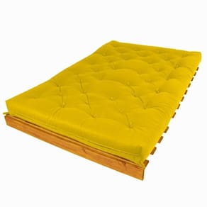 Material e estrutura: O colchão futon casal é fabricado em tecido de alta qualidade em sarja peletizada 100% algodão, seu enchimento é de mantas de algodão natural, manta fibra siliconada estruturado por espuma ortopédica D28. Possui amarras nas extremidades, a estrutura é produzida em madeira maciça de pinus autoclave com pintura na cor mel.