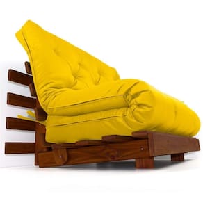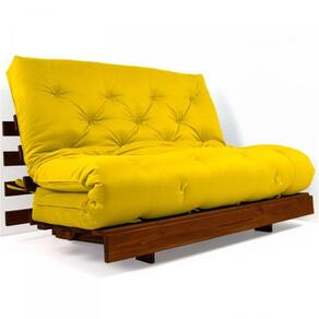 Material e estrutura: O colchão futon casal é fabricado em tecido de alta qualidade em sarja peletizada 100% algodão, seu enchimento é de mantas de algodão natural, manta fibra siliconada estruturado por espuma ortopédica D28. Possui amarras nas extremidades, a estrutura é produzida em madeira maciça de pinus autoclave com pintura na cor imbuia.