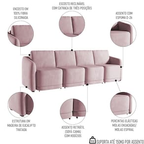 Características do Produto Material da estrutura: Madeira de Eucalipto Tratada. Material do Assento: Espuma D-26. Material do Encosto: 100% Fibra Siliconada. Revestimento: Veludo. Peso Suportado: 150 kg por assento. Quantidade de Assentos: 4 Assentos. Quantidade de Lugares: 4 Lugares. Tipo de Encosto: Reclinável com Catraca 3 Posições. Tipo de Assento: Retrátil. Possui Pés: Sim. Possui Rodízios: Sim. É sofá-cama: Sim. Diferenciais: - Design moderno. - Sofá cama modular. - Acompanha almofadas. - Assento com percintas elásticas, molas ensacadas e molas espiral. Sistema de Montagem: O produto é enviado montado, sendo necessário apenas a junção dos módulos. Manual de Montagem: Não. Volumes: 4 Volumes. Conteúdo da Embalagem: 1 Sofá Cama. Garantia do Fabricante: 90 dias contra defeito de fabricação. Montagem: Recomendamos que seja feita por um profissional. Recomendação de Limpeza: Utilize pano levemente úmido.