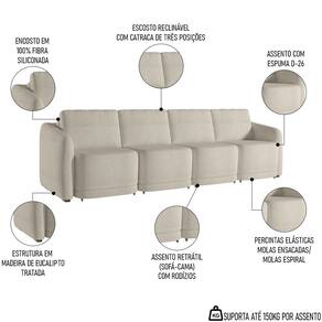 Características do Produto Material da estrutura: Madeira de Eucalipto Tratada. Material do Assento: Espuma D-26. Material do Encosto: 100% Fibra Siliconada. Revestimento: Bouclê. Peso Suportado: 150 kg por assento. Quantidade de Assentos: 4 Assentos. Quantidade de Lugares: 5 Lugares. Tipo de Encosto: Reclinável com Catraca 3 Posições. Tipo de Assento: Retrátil. Possui Pés: Sim. Possui Rodízios: Sim. É sofá-cama: Sim. Diferenciais: - Design moderno. - Sofá cama modular. - Acompanha almofadas. - Assento com percintas elásticas, molas ensacadas e molas espiral. Sistema de Montagem: O produto é enviado montado, sendo necessário apenas a junção dos módulos. Manual de Montagem: Não. Volumes: 4 Volumes. Conteúdo da Embalagem: 1 Sofá Cama. Garantia do Fabricante: 90 dias contra defeito de fabricação. Montagem: Recomendamos que seja feita por um profissional. Recomendação de Limpeza: Utilize pano levemente úmido.