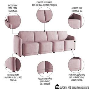Características do Produto Material da estrutura: Madeira de Eucalipto Tratada. Material do Assento: Espuma D-26. Material do Encosto: 100% Fibra Siliconada. Revestimento: Veludo. Peso Suportado: 150 kg por assento. Quantidade de Assentos: 4 Assentos. Quantidade de Lugares: 5 Lugares. Tipo de Encosto: Reclinável com Catraca 3 Posições. Tipo de Assento: Retrátil. Possui Pés: Sim. Possui Rodízios: Sim. É sofá-cama: Sim. Diferenciais: - Design moderno. - Sofá cama modular. - Acompanha almofadas. - Assento com percintas elásticas, molas ensacadas e molas espiral. Sistema de Montagem: O produto é enviado montado, sendo necessário apenas a junção dos módulos. Manual de Montagem: Não. Volumes: 4 Volumes. Conteúdo da Embalagem: 1 Sofá Cama. Garantia do Fabricante: 90 dias contra defeito de fabricação. Montagem: Recomendamos que seja feita por um profissional. Recomendação de Limpeza: Utilize pano levemente úmido.