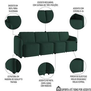 Características do Produto Material da estrutura: Madeira de Eucalipto Tratada. Material do Assento: Espuma D-26. Material do Encosto: 100% Fibra Siliconada. Revestimento: Veludo. Peso Suportado: 150 kg por assento. Quantidade de Assentos: 4 Assentos. Quantidade de Lugares: 5 Lugares. Tipo de Encosto: Reclinável com Catraca 3 Posições. Tipo de Assento: Retrátil. Possui Pés: Sim. Possui Rodízios: Sim. É sofá-cama: Sim. Diferenciais: - Design moderno. - Sofá cama modular. - Acompanha almofadas. - Assento com percintas elásticas, molas ensacadas e molas espiral. Sistema de Montagem: O produto é enviado montado, sendo necessário apenas a junção dos módulos. Manual de Montagem: Não. Volumes: 4 Volumes. Conteúdo da Embalagem: 1 Sofá Cama. Garantia do Fabricante: 90 dias contra defeito de fabricação. Montagem: Recomendamos que seja feita por um profissional. Recomendação de Limpeza: Utilize pano levemente úmido.