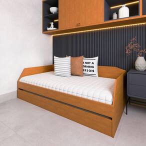 A cama auxiliar conta com rodízios deslizantes, que facilitam o manuseio e tornam a abertura prática e suave. Além disso, o estrado de madeira da cama auxiliar possui travessas antirruído, garantindo noites de sono mais silenciosas e confortáveis. Perfeito para quem quer unir conforto, funcionalidade e beleza em um único móvel.