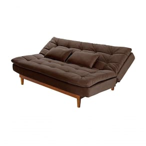 Este sofá cama acomoda tranquilamente 3 pessoas sentadas e duas deitadas, ele pode ser utilizado com até 3 posições diferentes, espumas de alto conforto com a densidade tanto no assento como no encosto Espuma D-26, com percintas elástica e molas bonel, pés e base em madeira maciça, acompanha 2 almofadas que podem ser utilizado como travesseiro.