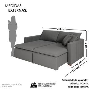 Ao estender o assento, transforma-se em um sofá-cama amplo e confortável, perfeito para hóspedes e descanso prolongado. Produto Montado: Sim Acompanha Almofadas extras: 02 Almofada do assento: Fixa Almofada do encosto: Removível Altura do assento até o chão: 50.0000 Altura do Braço: 64 cm Altura do Encosto: 60 cm Altura dos Pés: 5 cm Altura Máxima dos Pés: 5.0000 Ambiente Principal: Sala de Estar codigo_ean: 7900288221049 Complexidade da Montagem: Baixa: pode ser montado por uma pessoa sozinha Cor: Cinza Cor do Produto: Cinza Densidade do Assento: D-28 Enchimento do Assento: Espuma Enchimento do Braço: Espuma D-23 Enchimento do Encosto: Fibra Siliconada Estilo de Braço: Braços Quadrados Firmeza do Assento: Médio Itens Inclusos: 1 Sofá, 2 Almofadas e Kit Ferragens Largura do Braço: 15 cm Largura Total: 210 cm Linha ou Coleção: Uruguai Manual de Montagem e Instalação: https://product-hub-prd.madeiramadeira.com.br/325144880/documents/f3602856-7202-49ef-a459-b0c01665344a3178112596417568431152045.pdf Marca: Conceito Estofados Material da Corrediça do Sofá: Madeira Material dos Pés: Madeira Medida como Cama (A x L x P): 50x180x140 Modelo: Retrátil e Reclinável Necessita Montagem: Sim Nível de Conforto: Intermediário Origem do Produto: Nacional Peso: 94 kg Pet Friendly: Não Possui Baú: Não Possui Percintas Elásticas: Sim Possui Pés: 05 Possui Rodízio: Sim Profundidade Quando Estendido: 142 cm Profundidade quando extendido: 142.0000 Reclinável: Sim Recomendações de Uso, Manutenção e Limpeza: Limpar com pano seco ou levemente úmido com água, apenas. Revestimento do Braço: Bouclê Sistema de Montagem: Parafusos e encaixes Tecido Predominante: Bouclé Tipo de Assento: Fixo Tipo de Mola: Molas Bonnel Tipo de Sofá: Sofá Cama Marca: Não Informado